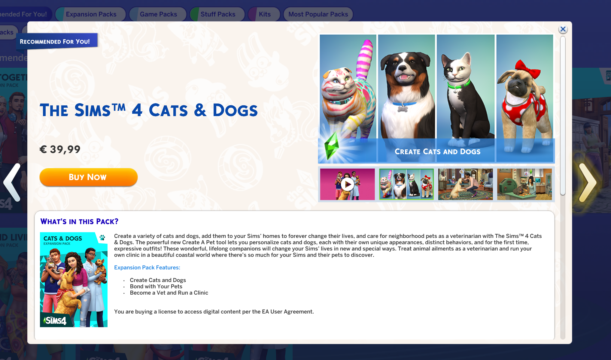 The Sims 4 is gratis. Maar er zijn veel uitbreidingen te koop. De uitbreidingen variëren in prijs en grootte. Voor een paar euro koop je een uitbreiding (ook wel: DLC) met extra outfits, en voor een groter bedrag koop je een DLC waardoor je Sims op vakantie kunnen.