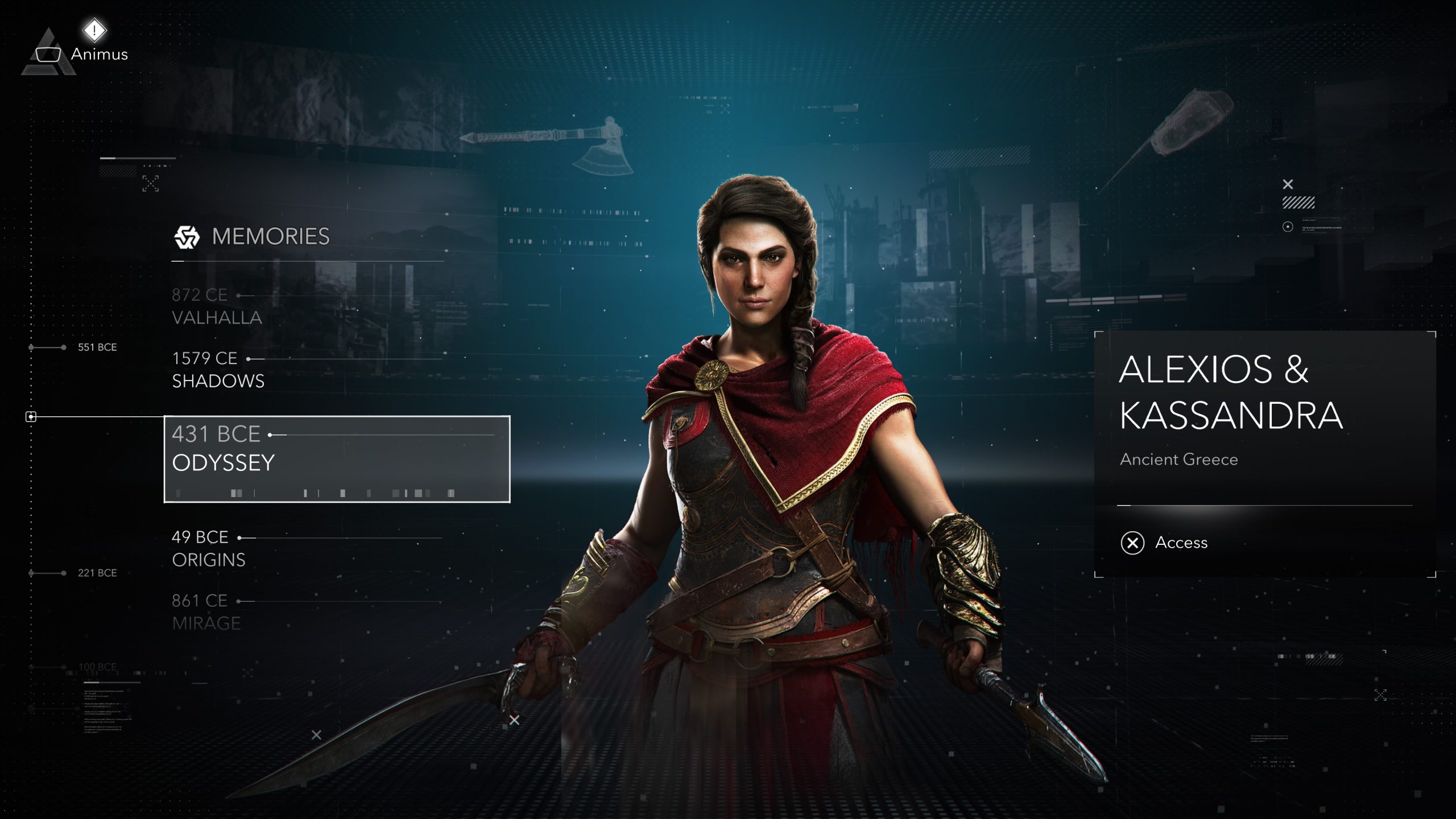 Wie de game opstart komt in een soort hoofdscherm terecht, de Animus Hub. Vanuit de Animus kun je andere games uit de reeks opstarten of kopen. De Animus biedt ook wekelijkse opdrachten en beloningen.