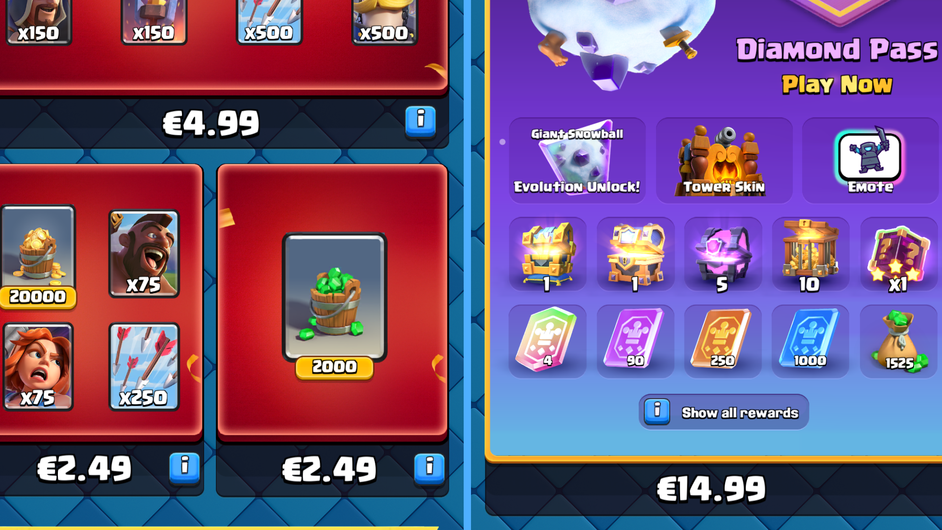 Er zit ook een season pass in Clash Royale, de ‘Pass Royale’. Koop je een upgrade voor deze seizoenkaart, dan krijg je een periode lang extra prijzen als beloning voor je vooruitgang.