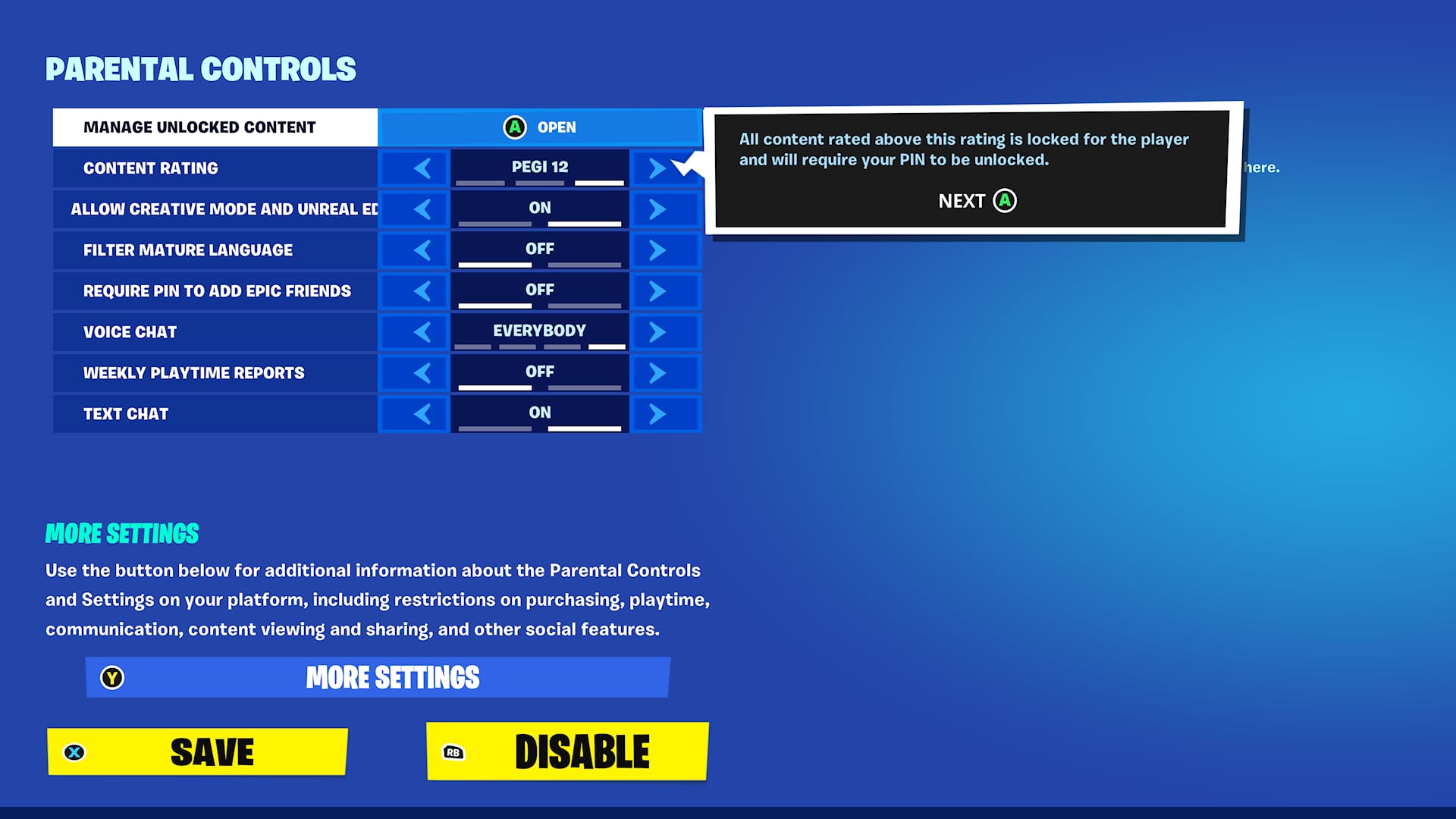 - Stel het ouderlijk toezicht naar wens in: geef een PEGI leeftijdslimiet aan, beperk chatfuncties of laat grof taalgebruik filteren