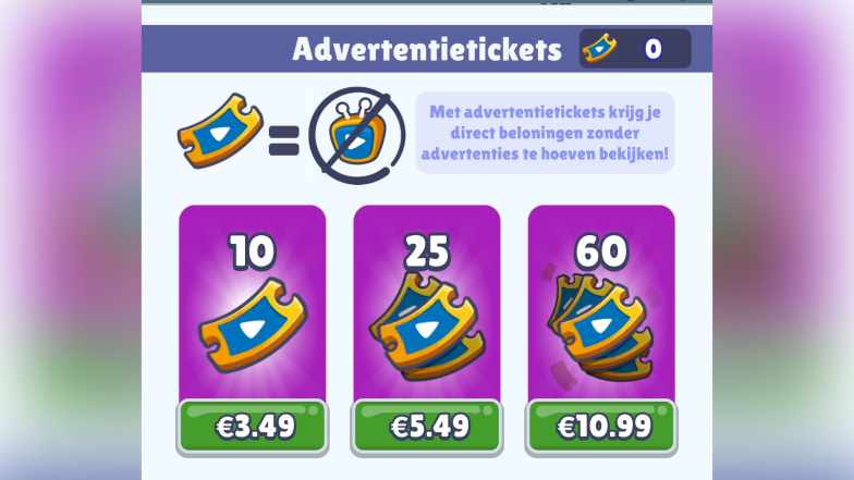Er verschijnen allerlei advertenties in Subway Surfers. Voor een paar euro kun je die ‘afkopen’. Maar soms krijg je een speciale beloning voor het kijken van een reclame. Wil je die reclame niet kijken? Dan krijg je de beloning ook niet.
