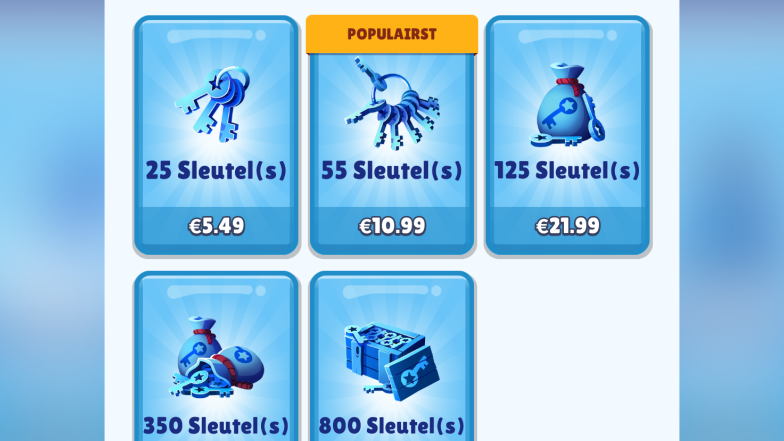 Munten en sleutels verzamel je ‘vanzelf’ door de game te spelen, maar je kunt ook munten en sleutels kopen met echt geld. Bijvoorbeeld: een nieuw poppetje kost 30.000 munten. Die kun je sparen in de game, maar je kunt ook een bundel van 40.000 munten kopen voor 5,49 euro.