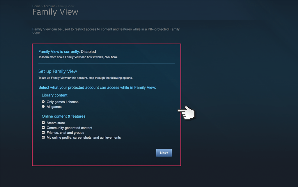 Steam biedt aardig wat technische hulpmiddelen om als ouder gebruik van te maken. De belangrijkste functie heet Family View (op een Nederlands account: ‘Gezinsweergave’). Hiermee stel je het account van je kind in zoals jij wilt en kun je bepaalde games, het gebruik van de forums en het uitgeven van geld afschermen met een pincode. Meer details over deze instellingen vind je op de website van Steam.